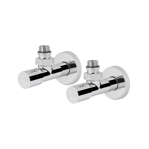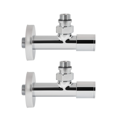 Комплект кранів Thermo Alliance Standart 1/2" НР кутовий SF395W15 призначений для використання при встановленні рушникосушки. Приладні крани виготовлені з високоякісної латуні, покриття — хромоване.