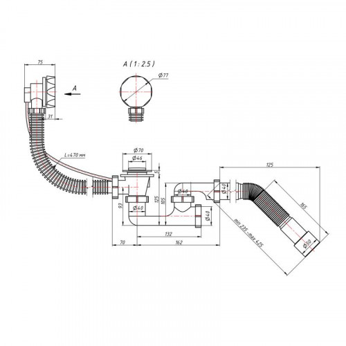 Додаткові характеристики Довжина переливу: 470 мм. Довжина троса: 560 мм. Довжина гофрованої труби: 235 – 425 мм.
