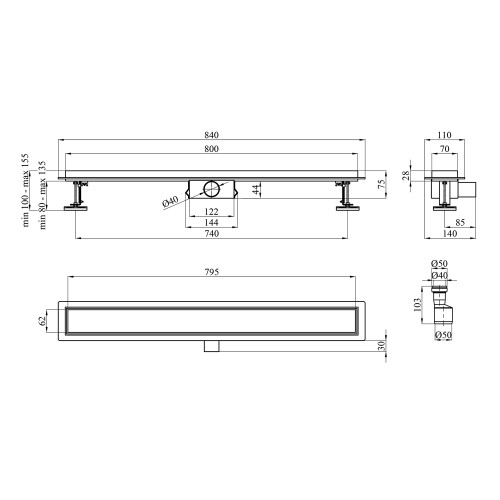 Модель оснащена сухим затвором, який ефективно запобігає проникненню неприємних запахів із каналізації навіть за тривалого невикористання душу. Горизонтальний випуск з діаметром 40 мм забезпечує стабільний відвід води, а регулювання по висоті в діапазоні 80–135 мм спрощує монтаж та дозволяє адаптувати трап до різних умов укладання підлоги.