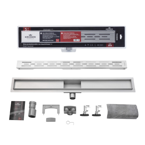 Завдяки прямокутній формі та розміру решітки 595х62 мм, трап ідеально підходить для сучасних душових кабін. Надійність виробу підтверджується гарантією 60 місяців, що робить Kroner KRP Eifel L60 Linien практичним і довготривалим вибором для вашої ванної кімнати.