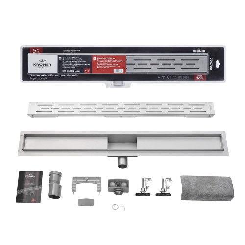 Завдяки прямокутній формі та розміру решітки 695х62 мм, трап ідеально підходить для сучасних душових кабін. Надійність виробу підтверджується гарантією 60 місяців, що робить Kroner KRP Eifel L70 Linien практичним і довготривалим вибором для вашої ванної кімнати.