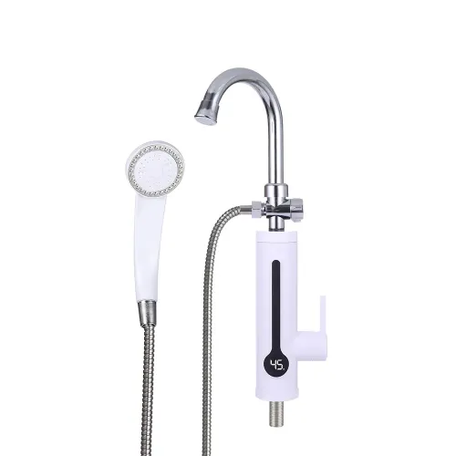 Проточний водонагрівач для кухні з поворотним виливом та багаторазовим термозапобіжником. При роботі тена в нижньому правому кутку дисплея мигатиме крапка. При вимкненні нагріву крапка зникає. При перемиканні з гарячої на холодну воду дисплей продовжить працювати ще 10 секунд. При перегріві води в корпусі водонагрівача більше 60°C, нагрів зупиниться, а дисплей згасне. Через кілька хвилин робота водонагрівача відновиться, але потрібно визначити причини перегріву і усунути їх. Корпус виготовлено з ABS пластику білого кольору. Живлення АС 220-240В, 50Гц. Тен потужністю 3.3кВт. Температура нагріву 30 - 65°C. Тиск в системі від 0.5 до 6 бар. Індикація температури за допомогою дисплея. Клас захисту - ІРХ4. Встановлення на ванну, фіксація прижимною гайкою, гідравлічне з'єднання - зовнішня різьба 1/2". В комплекті: водонагрівач, дивертор, душовий шланг 1,2 м., душова лійка, вилив, кабель 1.2 м. з вилкою європейського зразка. Гарантія 1 рік.