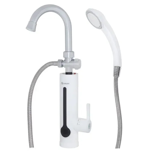 Проточний водонагрівач для ванної з поворотним виливом та винесеним на корпус багаторазовим термозапобіжником. Корпус виготовлено з ABS пластику білого кольору. Живлення АС 220-240В, 50Гц. Тен потужністю 3.3кВт. Температура нагріву 30 - 65°C. Тиск в системі від 0.5 до 6 бар. Індикація температури за допомогою дисплея. Клас захисту - ІРХ4. Встановлення на ванну, фіксація прижимною гайкою, гідравлічне з'єднання - зовнішня різьба 1/2". В комплекті: водонагрівач, дивертор, душовий шланг 1,2 м., душова лійка, вилив, кабель 1.2 м. з вилкою європейського зразка. Гарантія 1 рік.