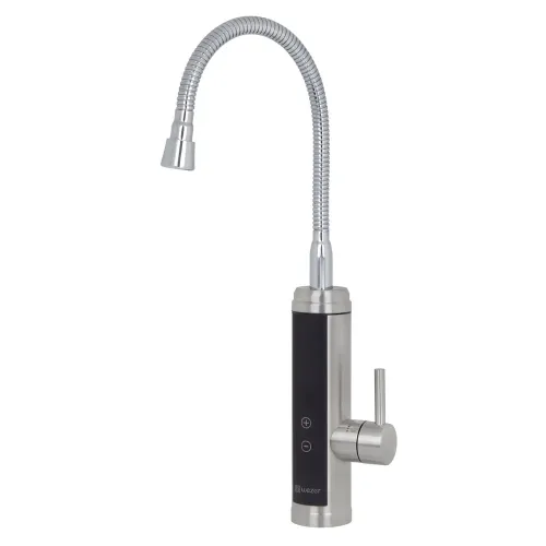 Проточний водонагрівач для кухні з поворотним рефлекторним виливом та регулюванням т-тури від 30 до 55°C. Корпус виготовлено з нержавіючої сталі у кольорі - сатин. Живлення АС 220-240В, 50Гц. Тен потужністю 3.3кВт. Тиск в системі від 0.5 до 6 бар. Індикація температури за допомогою дисплея. Клас захисту - ІРХ4. Встановлення на мийку, фіксація прижимною гайкою, гідравлічне з'єднання - зовнішня різьба 1/2". В комплекті кабель 1.2 метри з вилкою європейського зразка. Гарантія 1 рік.
